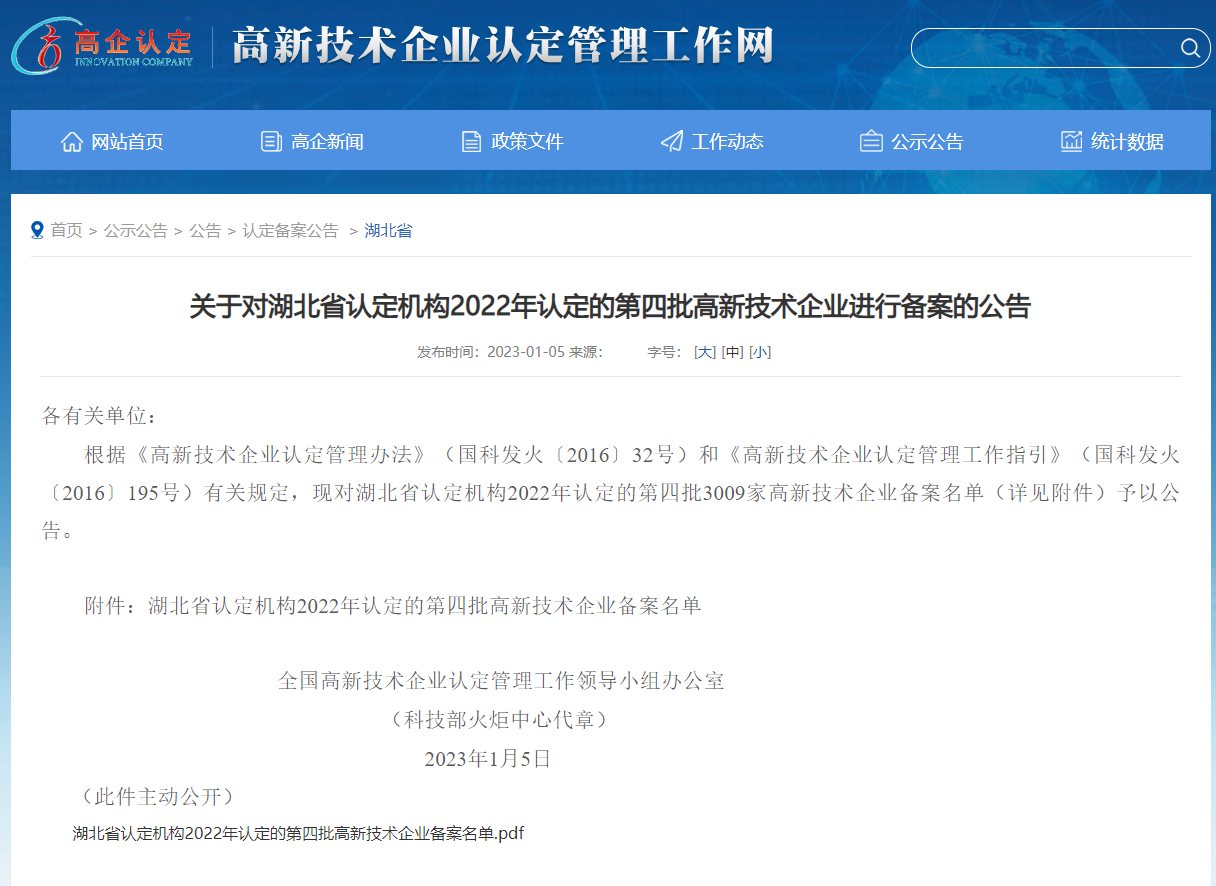 1月5日,在全国高新技术企业认定管理工作领导小组办公室发布的公告中,成套公司榜上有名,顺利通过2022年度第四批高新技术企业认定,获得国家级“高新技术企业”资质(证书编号为:GR202242004985)。