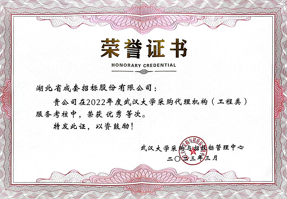 4月27日,武汉大学采购与招投标管理中心(以下简称“招标中心”)组织召开武汉大学采购代理服务考核反馈工作会议,会议宣布了2022年度武汉大学采购代理机构服务考核结果。成套公司在工程类服务考核中从9家代理机构里脱颖而出,荣获优秀等次。