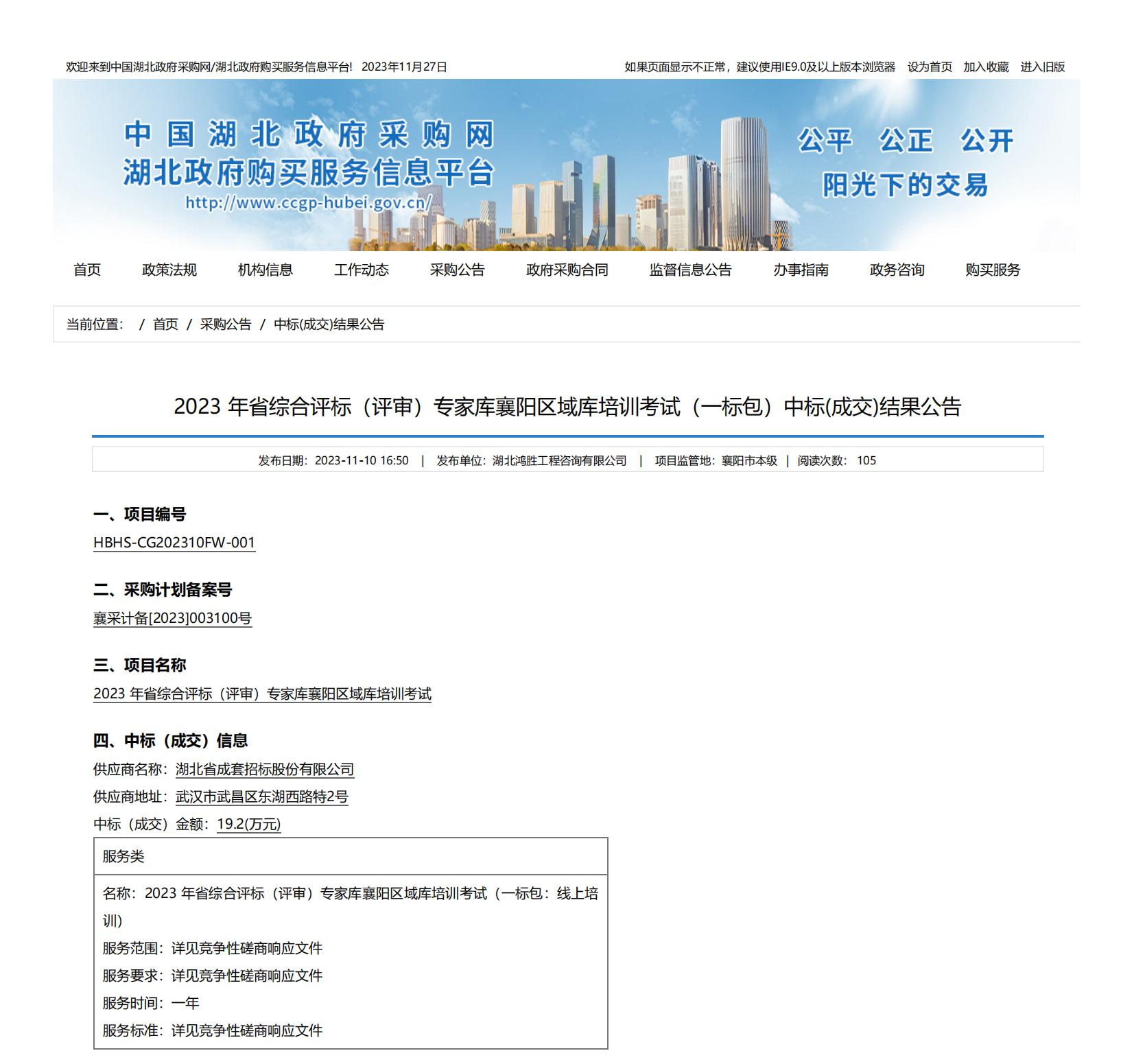 近日,成套公司凭借领先的综合实力和良好的行业口碑,顺利承揽“2023年省综合评标(评审)专家库襄阳区域库培训考试”服务项目。