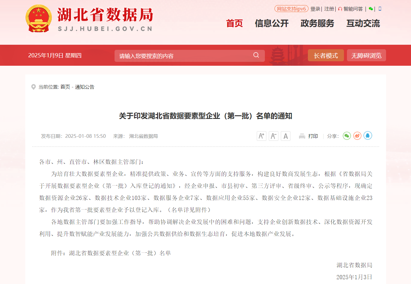 1月8日,湖北省数据局发布湖北省数据要素型企业(第一批)名单,伟德国际1946入选湖北省首批登记入库的“数据技术企业”和“数据应用企业”。